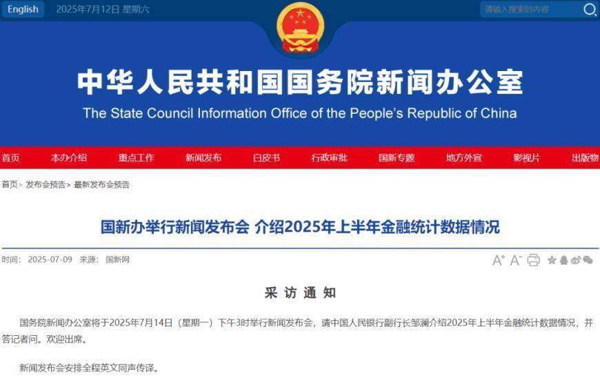 国务院新闻办公室将于2025年7月14日(星期一)下午3时举行新闻发布会,中国人民银行副行长邹澜将介绍2025年上半年金融统计数据情况,并答记者问。